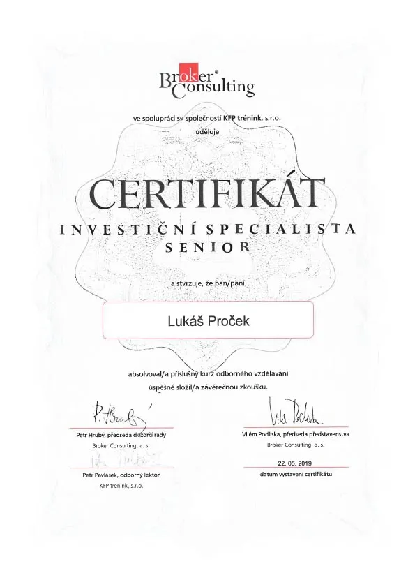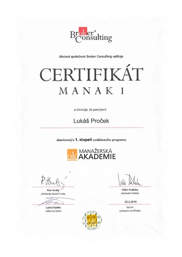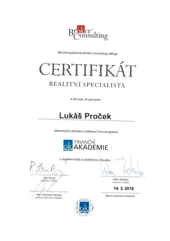 Mé jméno je Lukáš Proček a pracuji v oboru financí a realit ve společnosti Broker Consulting a.s.. Do Broker Consulting jsem přišel z velké mezinárodní společnosti Decathlon, kde jsem začínal již jako student vysoké školy. Ve druhém ročníku jsem se rozhodl využít svůj potenciál a přešel na dálkové studium, jelikož jsem dostal příležitost sestavit velký obchodní tým lidí a zodpovídat za ekonomické výsledky prodejny. Tato příležitost se nedala odmítnout
